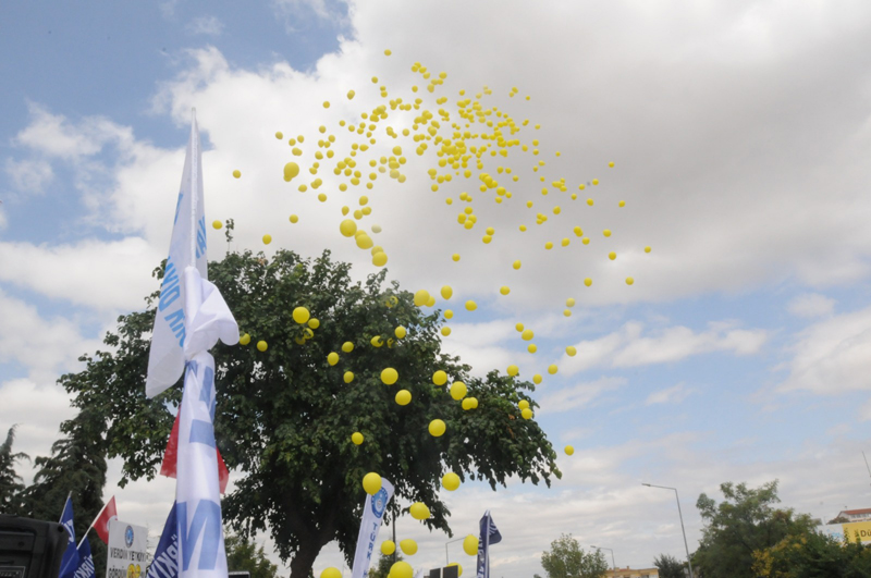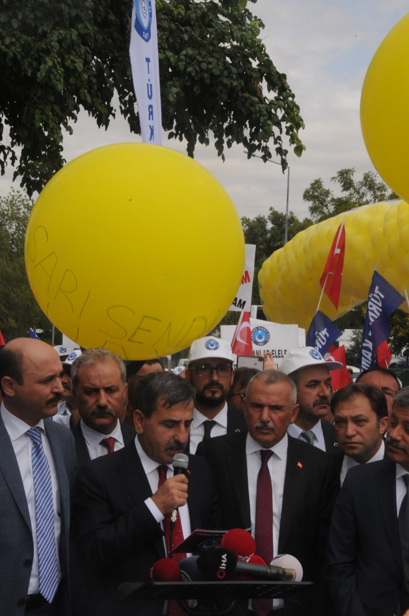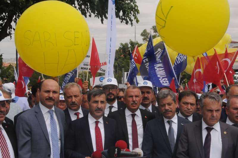 Katılımcıların attığı “Sarı sendika istemiyoruz' sloganları ile inleyen Çalışma Bakanlığı binası önünde hazırlanan sarı balonlar da patlatılarak, yetkili konfederasyona “Masada memuru pazarlamayın' uyarısında bulunuldu.