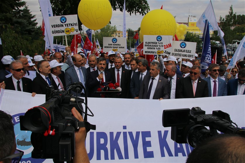 “Hepinizin bildiği gibi 3 milyon memur, 2 milyon emekli, aileleriyle birlikte 20 milyon vatandaşımızı doğrudan ilgilendiren, nüfusumuzun 4’te 1’inin iki yıllık geleceğini şekillendirecek toplu sözleşme görüşmeleri büyük bir hayal kırıklığına doğru gitmektedir. Geçtiğimiz yıl gerçekleşen resmi enflasyon %20,3 oldu. 4 kişilik ailenin vaz geçemeyeceği, zorunlu harcama tutarı 1032 lira artarken memur maaşlarına koca bir yıl için toplam 441 lira zam yapıldı. TÜİK’in açıklamasına göre yalnızca kiraya son bir yıl içinde gelen zam 100 lira. Ailenin aylık gıda harcamasına gelen zam ortalama 197 lira. Doğalgaza bir yıl içinde gelen zam %18,6. Elektriğe %34,8 zam yapılmış. Mutfak yangın yerine dönmüş, memurun, emeklinin bütçesi tarumar olmuş… Hem resmi rakamlar hem de yaptığımız hesaplar, memur ve emeklinin alım gücünün düştüğünü gösteriyor.